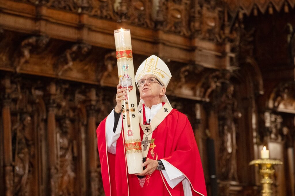 Finalmente, siguiendo la tradición que recibimos de Pentecostés, antes de la bendición final, el arzobispo de Lima sopló el cirio pascual sobre el Pueblo de Dios como signo de que el Espíritu se reparte en toda la Iglesia.