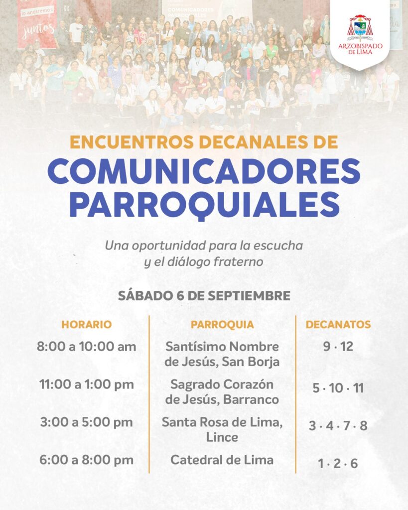 La Comisión de Comunicación del Arzobispado de Lima anunció una serie de encuentros decanales dirigidos a comunicadores parroquiales. Se desarrollará durante el sábado 6 de septiembre en distintos puntos de la ciudad. ¡Aquí toda la información!