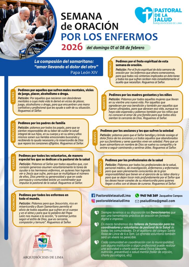En respuesta al llamado del Papa León XIV, la Pastoral de Salud de la Arquidiócesis de Lima viene impulsando la Semana de Oración por los Enfermos 2026, iniciativa que cuenta con la participación del clero limeño, agentes pastorales de hospitales, parroquias y  comunidades.