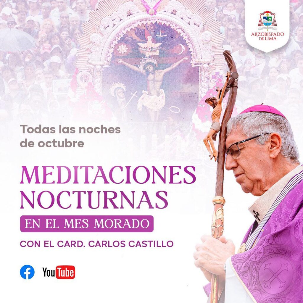 Al llegar el mes de octubre, nos unimos espiritualmente a nuestro Señor de los Milagros y los invitamos a participar de las «Meditaciones Nocturnas en el Mes Morado», con el Arzobispo de Lima, Monseñor Carlos Castillo.