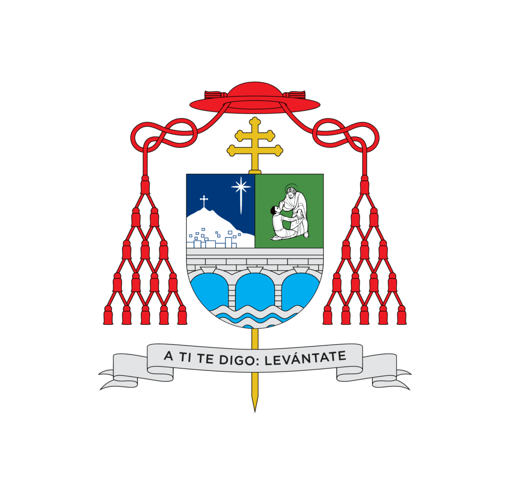 Desde un fondo verde y en recuerdo de que estamos en un claro contexto de crisis ecológica donde la esperanza de salvación es la esperanza de ser resucitados todos y todo en la vida plena del amor de Dios, que se expresa en nuestro lema, como en el caso del joven y la joven: “a ti te digo levántate”, dirigido a nuestra arquidiócesis y a Lima toda.
